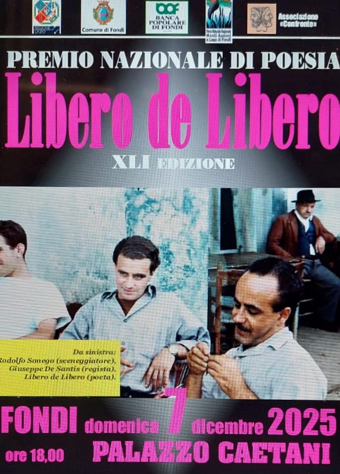 41^ ed. Premio Nazionale di poesia “Libero de Libero” Domenica 7 dicembre – 18:00Palazzo Caetani – Ass. Confronto Data domenica, 07 Dic 2025 Terminato! Ora 18:00 Orario Fuso orario: America/New_York Data: domenica, 07 Dic 2025 Ora: 12:00 Maggiori informazioni Leggi di più Luogo Palazzo Caetani Corso Appio Claudio, 3, Fondi (LT) Sito web https://goo.gl/maps/eofvYmkS1kD7T7EM9 Categoria Cerimonia Culturale Eventi Organizzatore Associazione di Servizi Culturali Confronto Leggi di più Condividi questo evento Ricerca per: Tutti Gli Eventi Prossimi Eventi Nessun evento trovato! Notizie Su Fondi Ultime Notizie Come riconoscere truffatori e malintenzionati: doppio incontro presso i centri anziani della città Corso gratuito di difesa personale femminile il 20 e il 27 febbraio “Mylle sfumature d’azzurro” mercoledì 25 febbraio a Palazzo Caetani “One World, One Breath. Fondi-Australia: yoga sotto lo stesso cielo”: il 28 febbraio a Fondi Carnevale 2026 a Fondi: tanti eventi per grandi e piccini Seguici sui Social