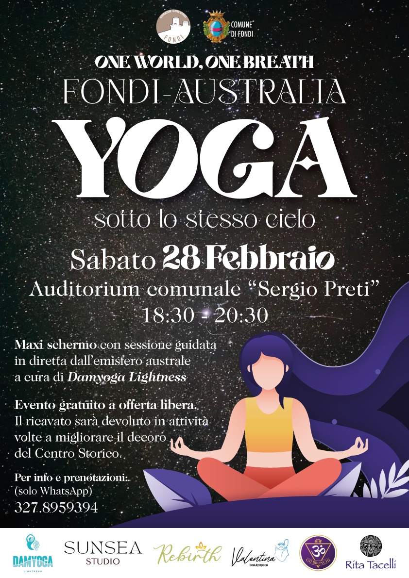 “One World, One Breath. Fondi-Australia: yoga sotto lo stesso cielo” è il titolo dell’evento organizzato dall’Associazione “Centro Storico”, con il patrocinio del Comune di Fondi, che si terrà presso l’Auditorium comunale “Sergio Preti” a partire dalle 18:30.