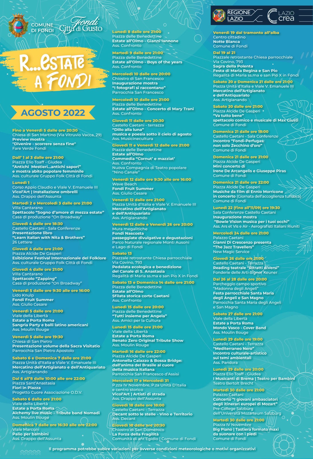 Entra nel vivo il cartellone degli appuntamenti estivi “R…Estate a Fondi”. Dopo gli eventi di luglio 2022, ecco il calendario del mese di agosto:
