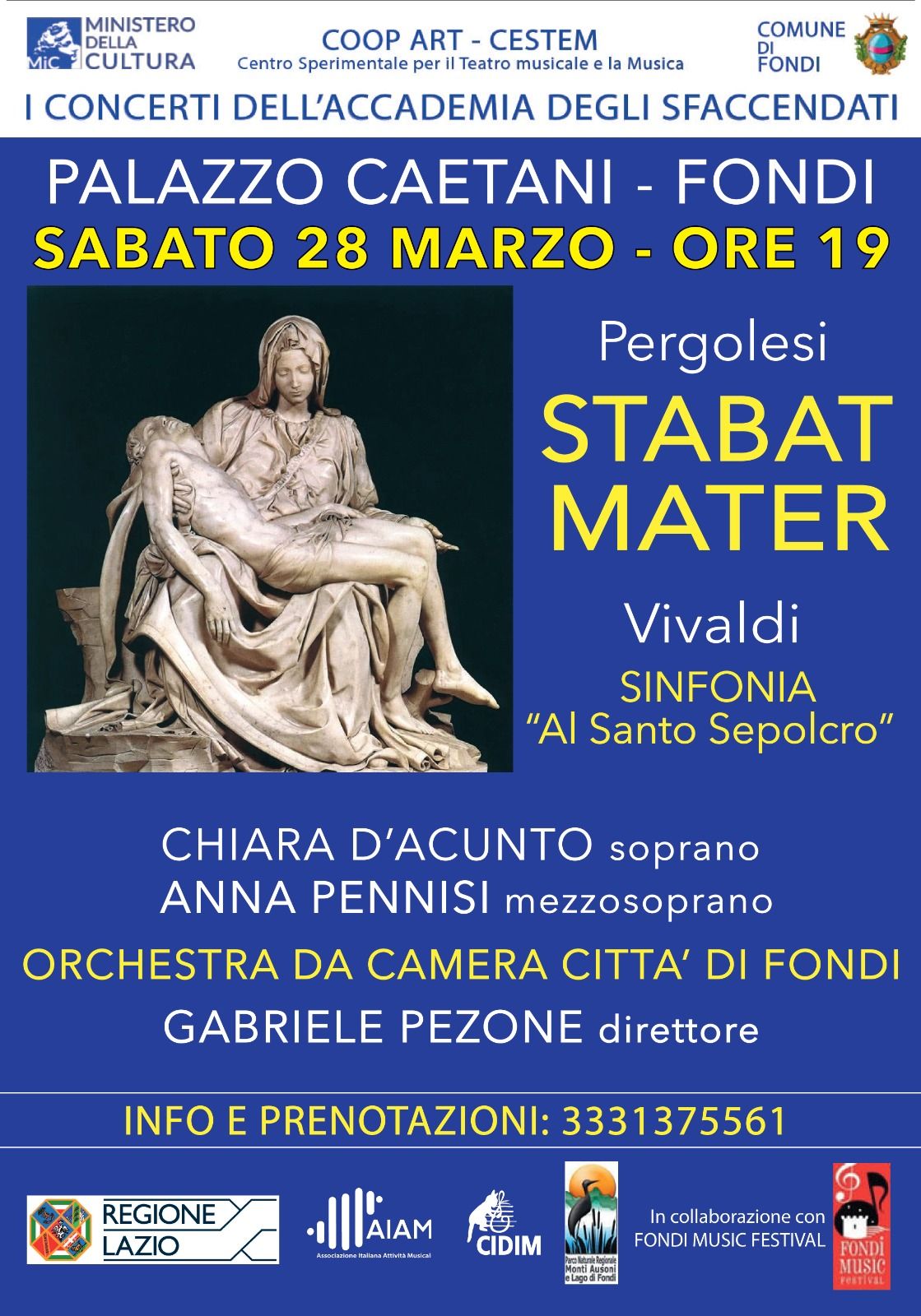 La Programmazione 2026 de “I Concerti dell’Accademia degli Sfaccendati”, alla vigilia della settimana pasquale, propone al Palazzo Caetani di Fondi, sabato 28 marzo, alle ore 19, un appuntamento con due capolavori della musica sacra: lo “Stabat Mater” di Pergolesi e la Sinfonia “Al Santo Sepolcro” di Vivaldi.
