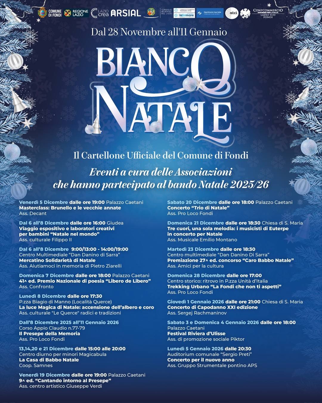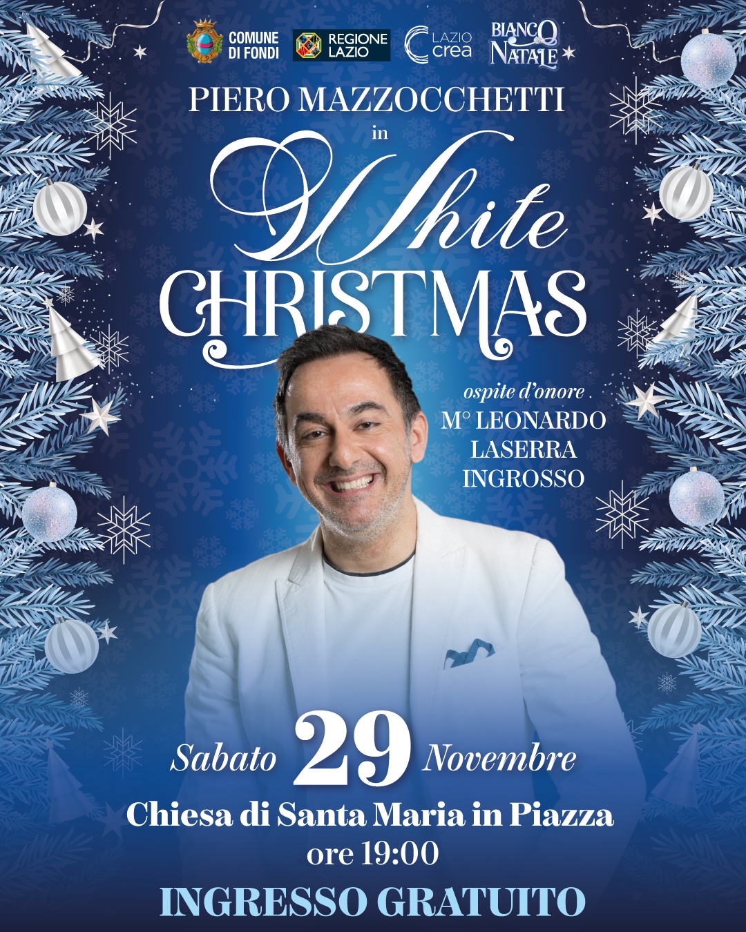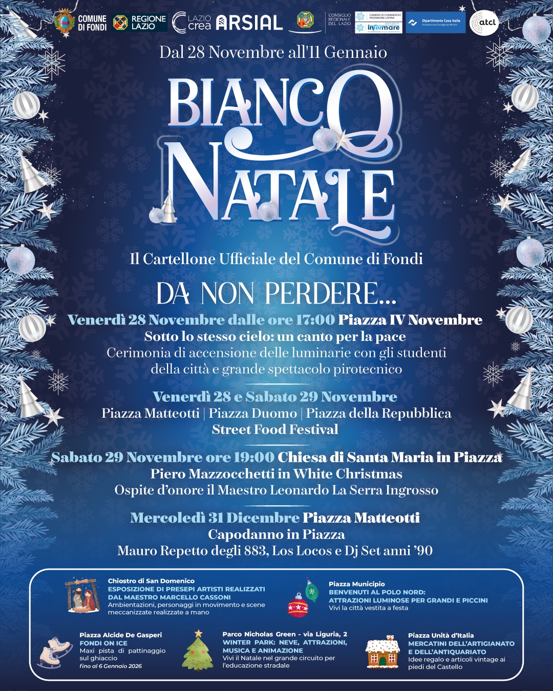 Si partirà in grande stile con una straordinaria due giorni di Street Food, finanziata mediante la partecipazione ad un bando Arsial. Il 29 novembre, alle 19:00, presso la Chiesa di Santa Maria in Piazza, si terrà inoltre il concerto inaugurativo del Natale fondano che, in omaggio al tema scelto, si intitolerà “White Christmas”. La voce tenore Piero Mazzocchetti, che già più volte ha incantato il pubblico fondano, sarà accompagnata al pianoforte dal Maestro e cittadino onorario di Fondi Leonardo Laserra Ingrosso.